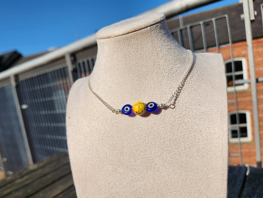 blue evil eye and yellow beads silver chain choker necklace