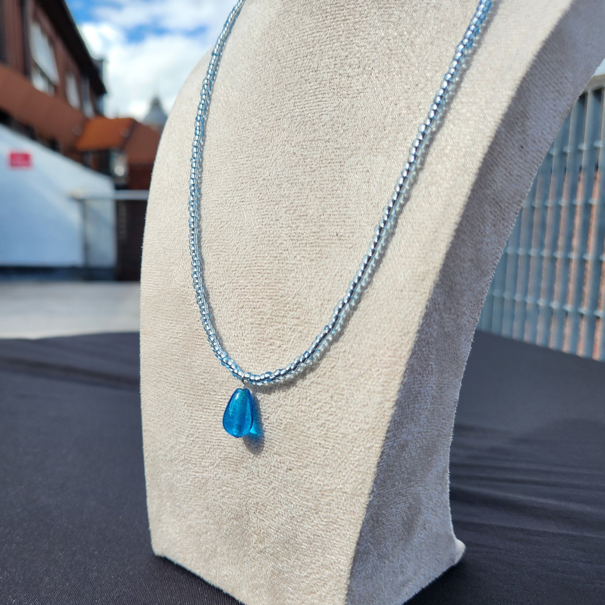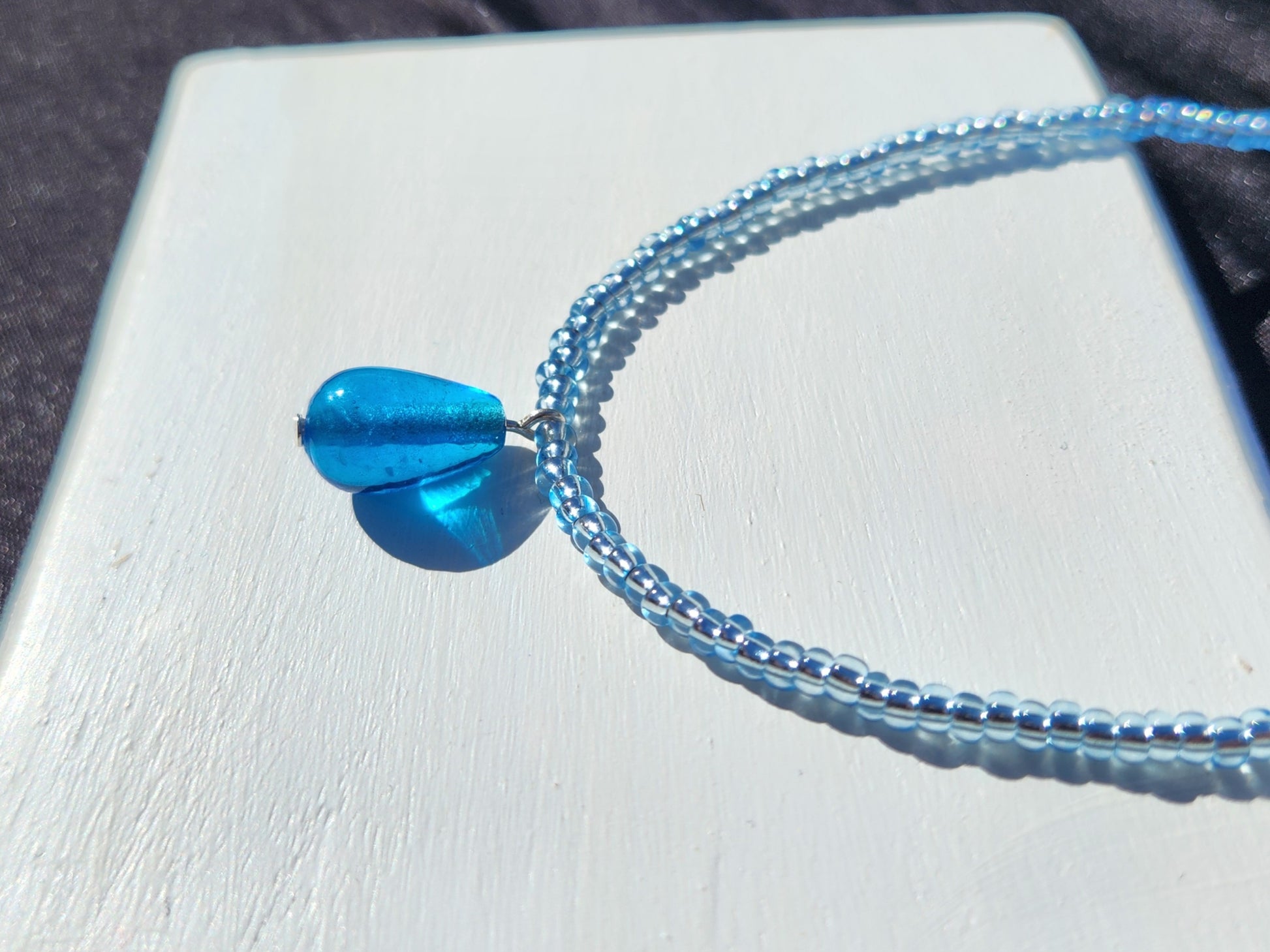 blue glass seed beads and blue upcycled glass teardrop bead.
