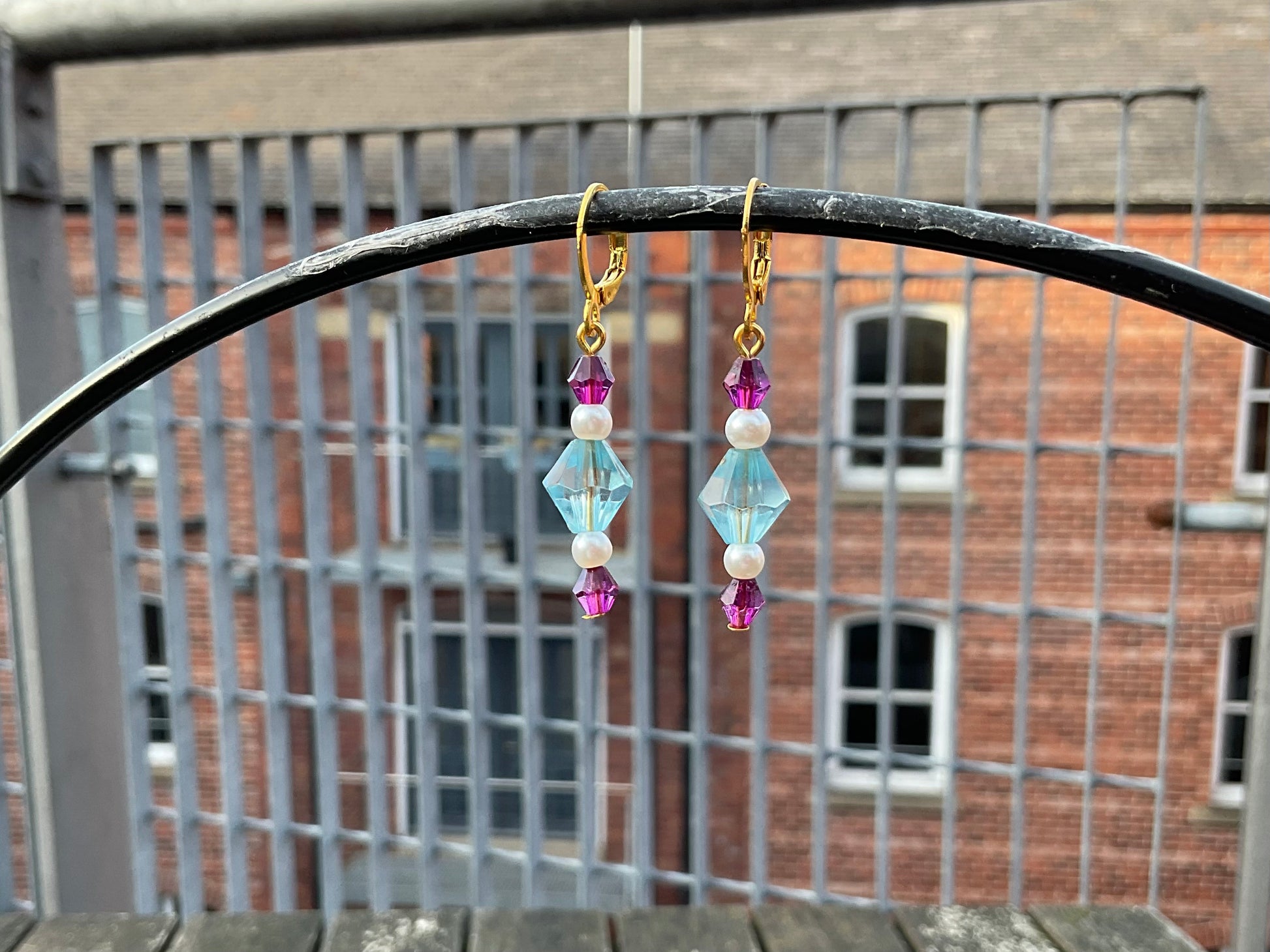 blue & pink crystal beaded gold huggie hoop earrings