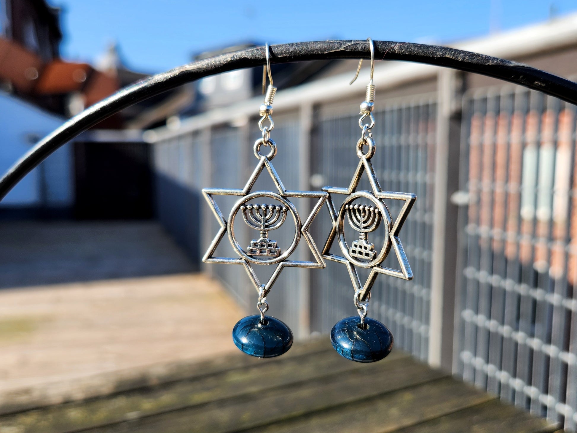 silver-plated star of david/magen david earrings with upcycled blue beads.