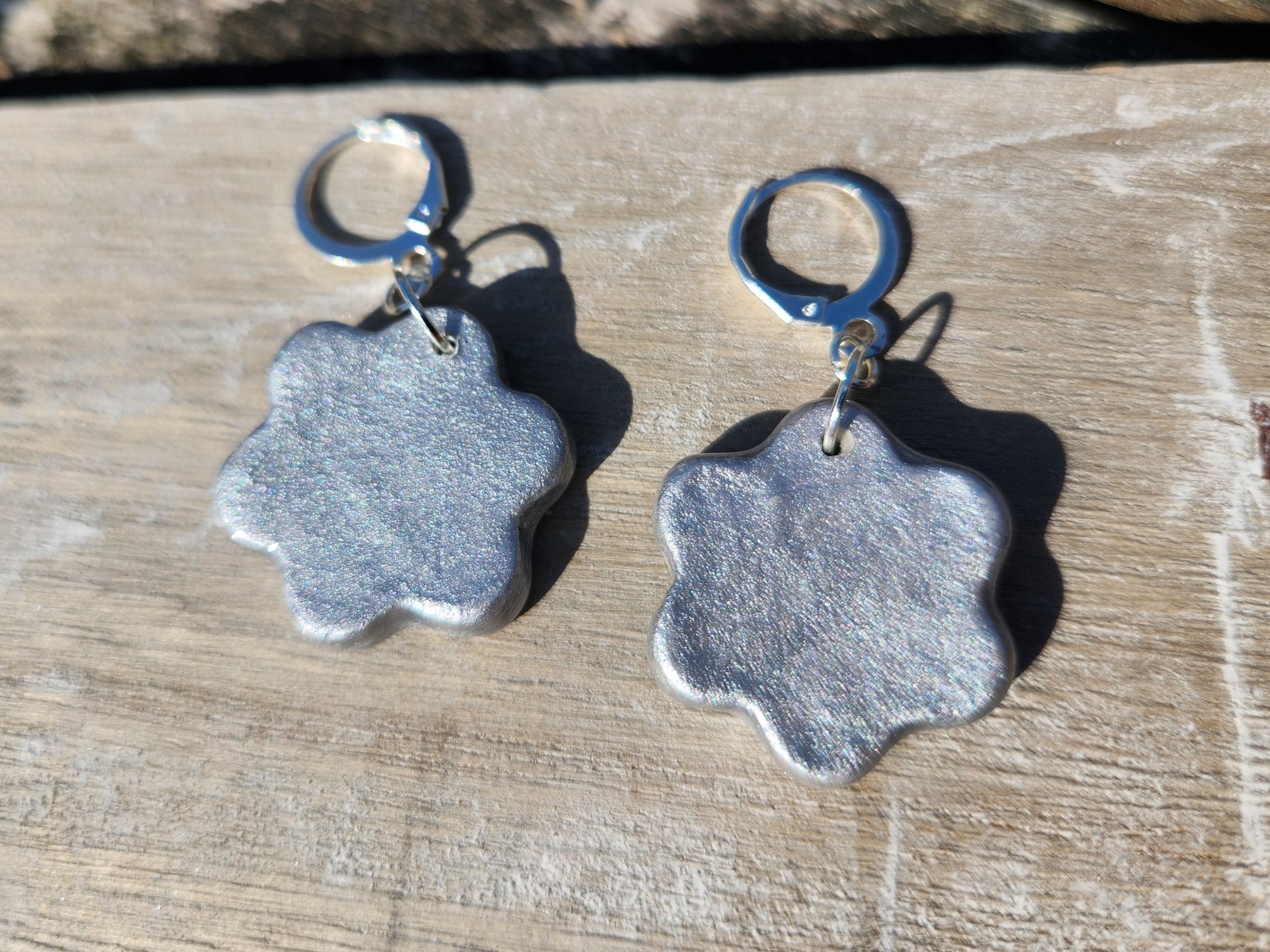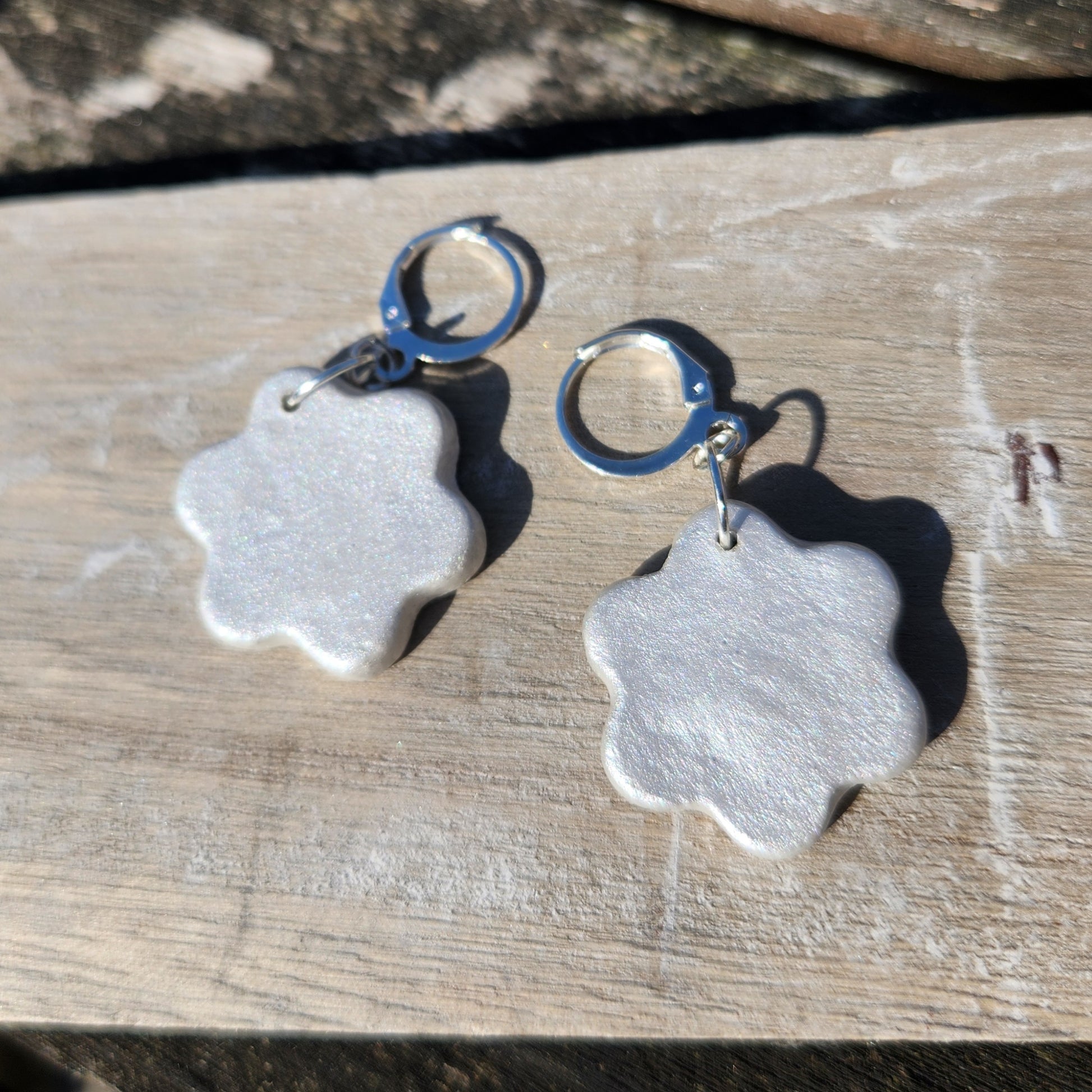 flower-shaped clay charms, with silver-plated huggie hoops. available in multiple colours. hand-painted air dry clay, sealed with UV resin. lightweight and semi-waterproof.