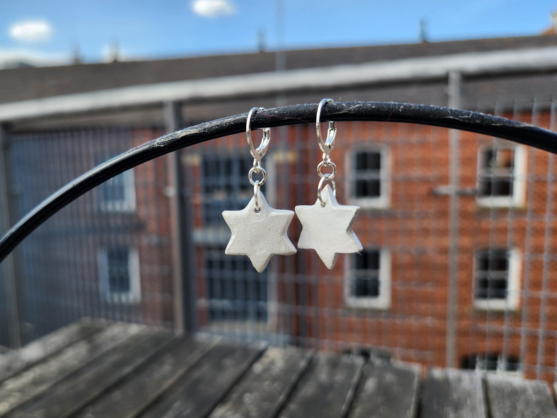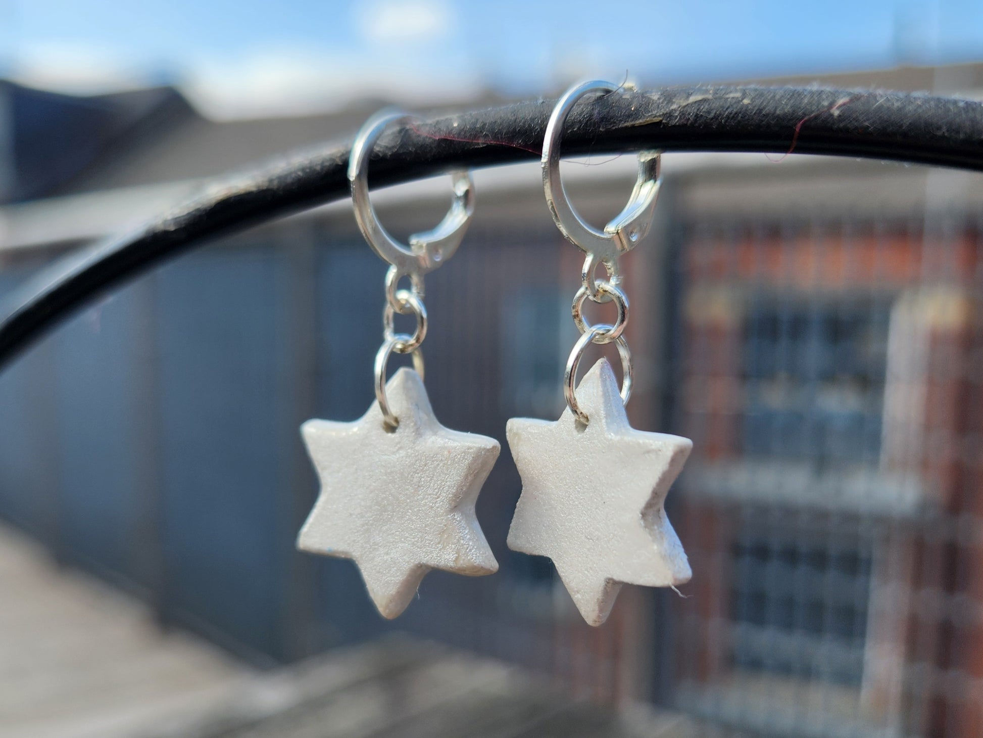 silver star of david/magen david charm earrings on silver-plated huggie hoops. hand-painted air dry clay, sealed with UV resin. lightweight and semi-waterproof.