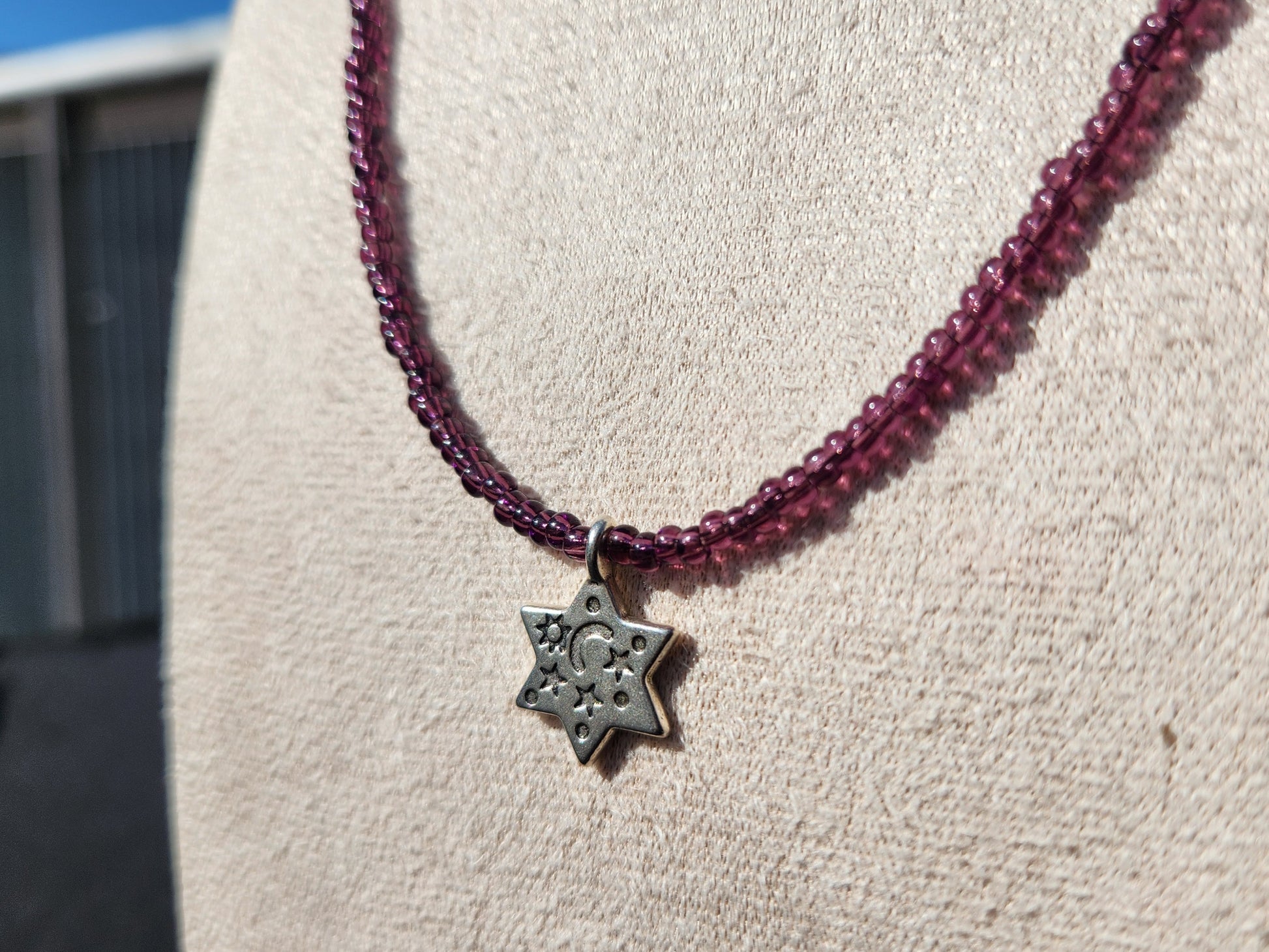 silver-plated magen david/star of david pendant on cream-coloured glass seed bead necklace.